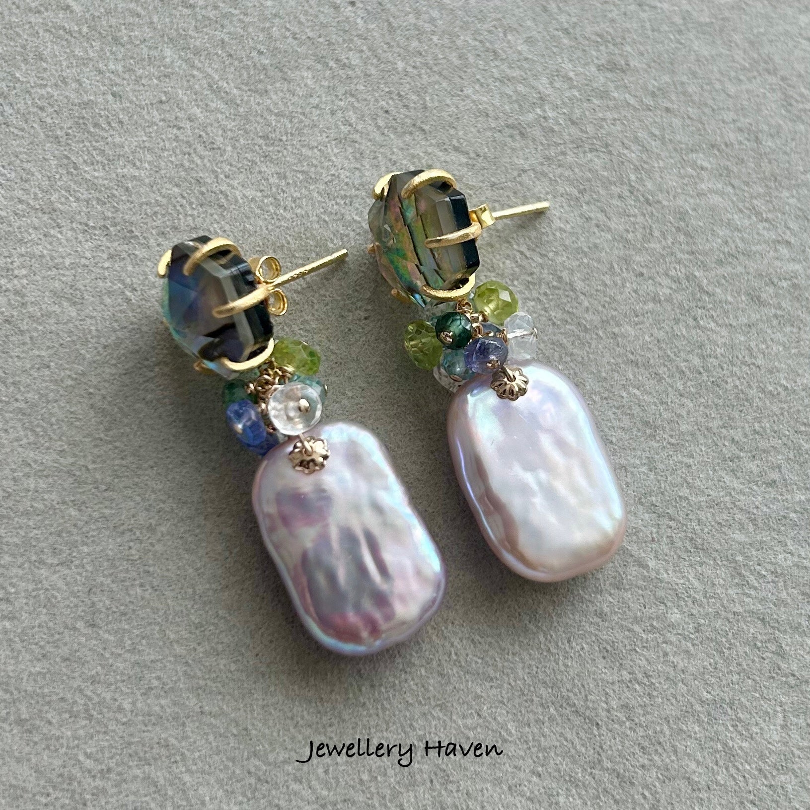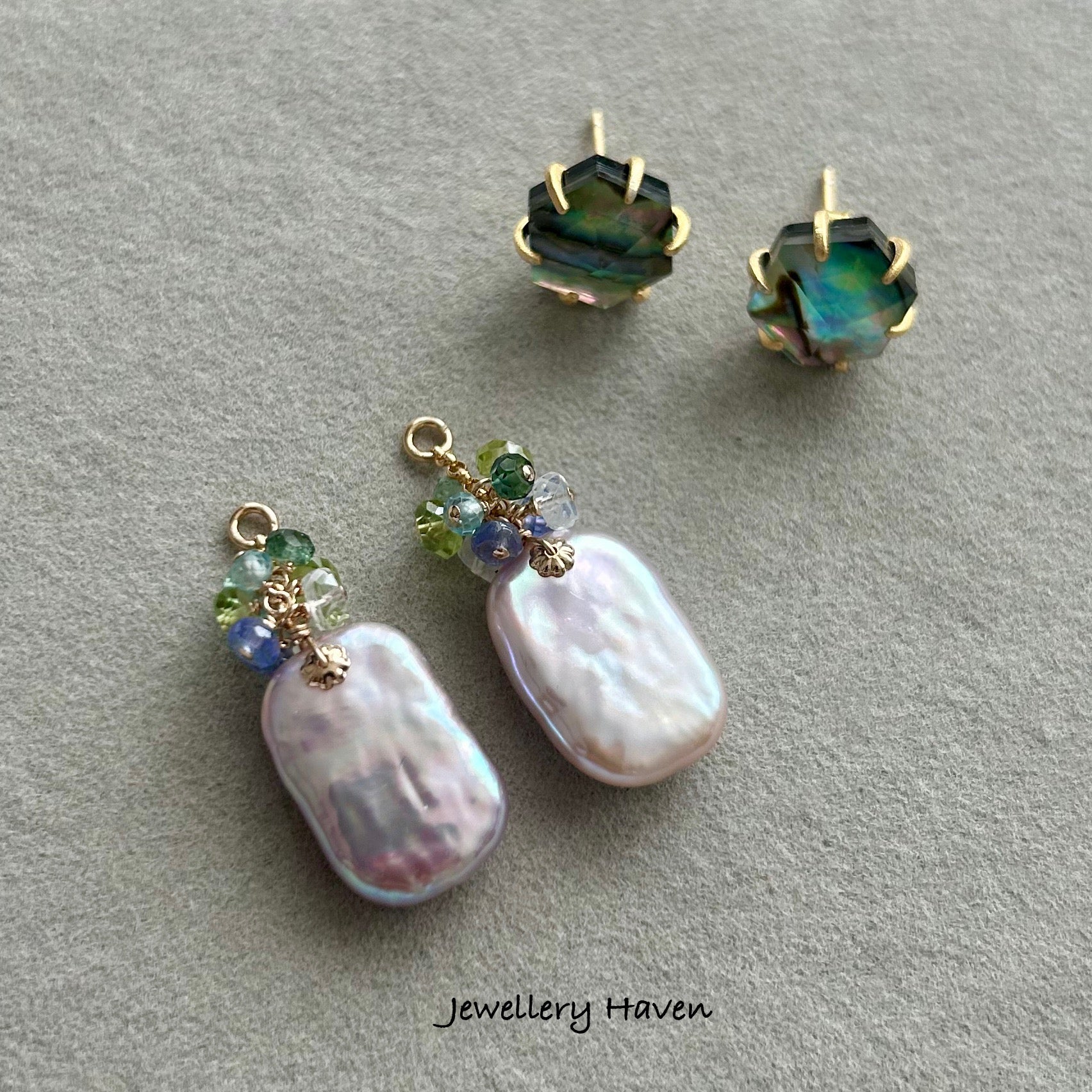 Iridescent lavender pearls and hexagon abalone shell stud earrings (detachable dangle)