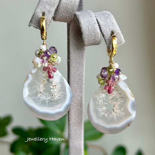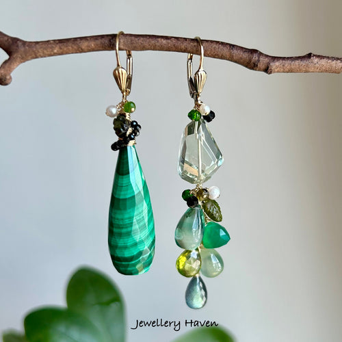 Iridescent baroque pearl, Ethiopian opal and green tourmaline earrings