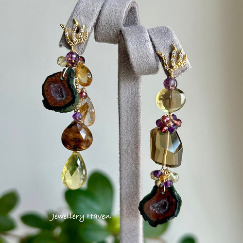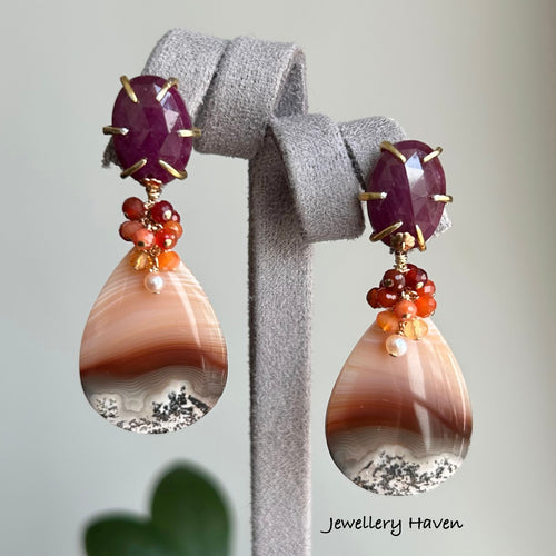 Banded agate, ruby and obsidian stud earrings (detachable dangle)