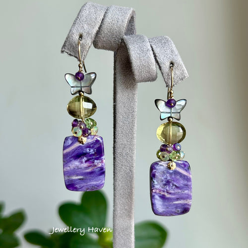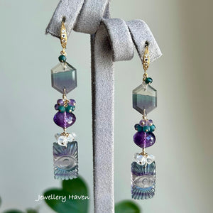 Shattuckite, green tourmaline and Herkimer quartz earrings