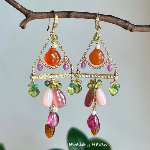 Carnelian, pink sapphire, peridot, pink opal chandelier earrings