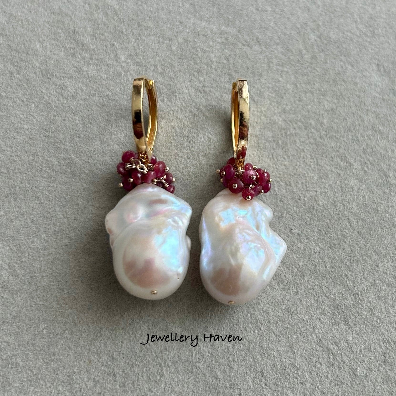 Pinkish iridescence white baroque pearl and ruby earrings