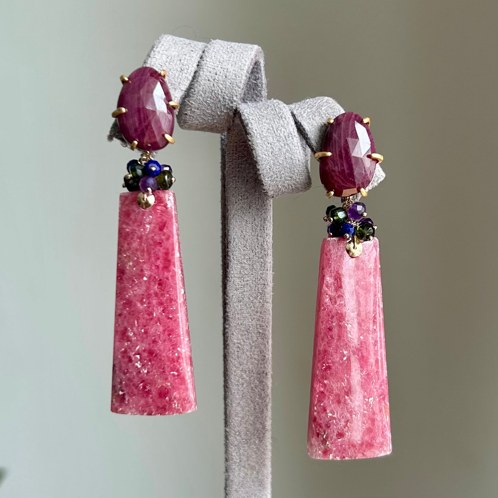 ** Amethyst, lapis lazuli and green tourmaline clusters.
